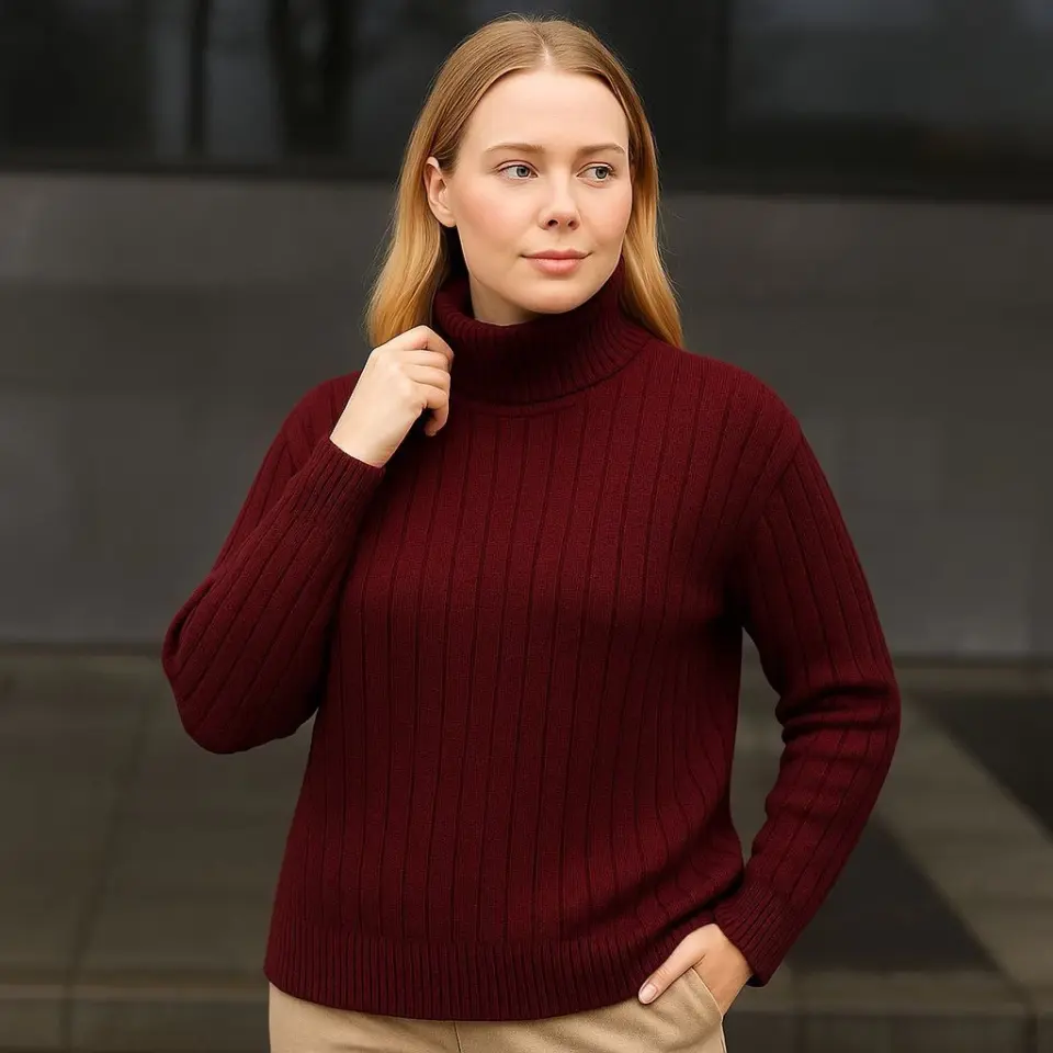 Balıkcı Yaka Bağazlı Triko Kazak Pamuklu Kalın Fitilli Dokuma - Bordo