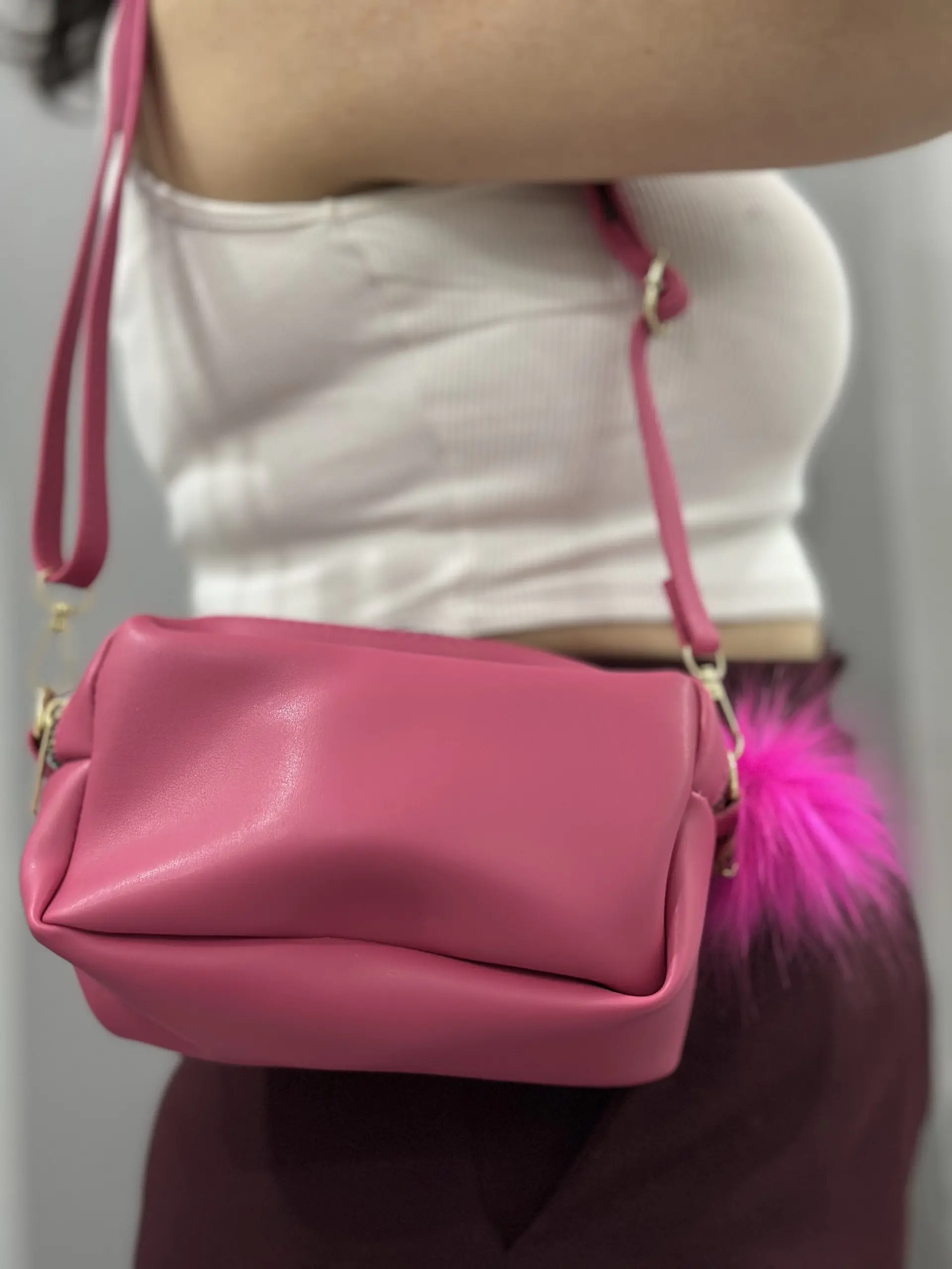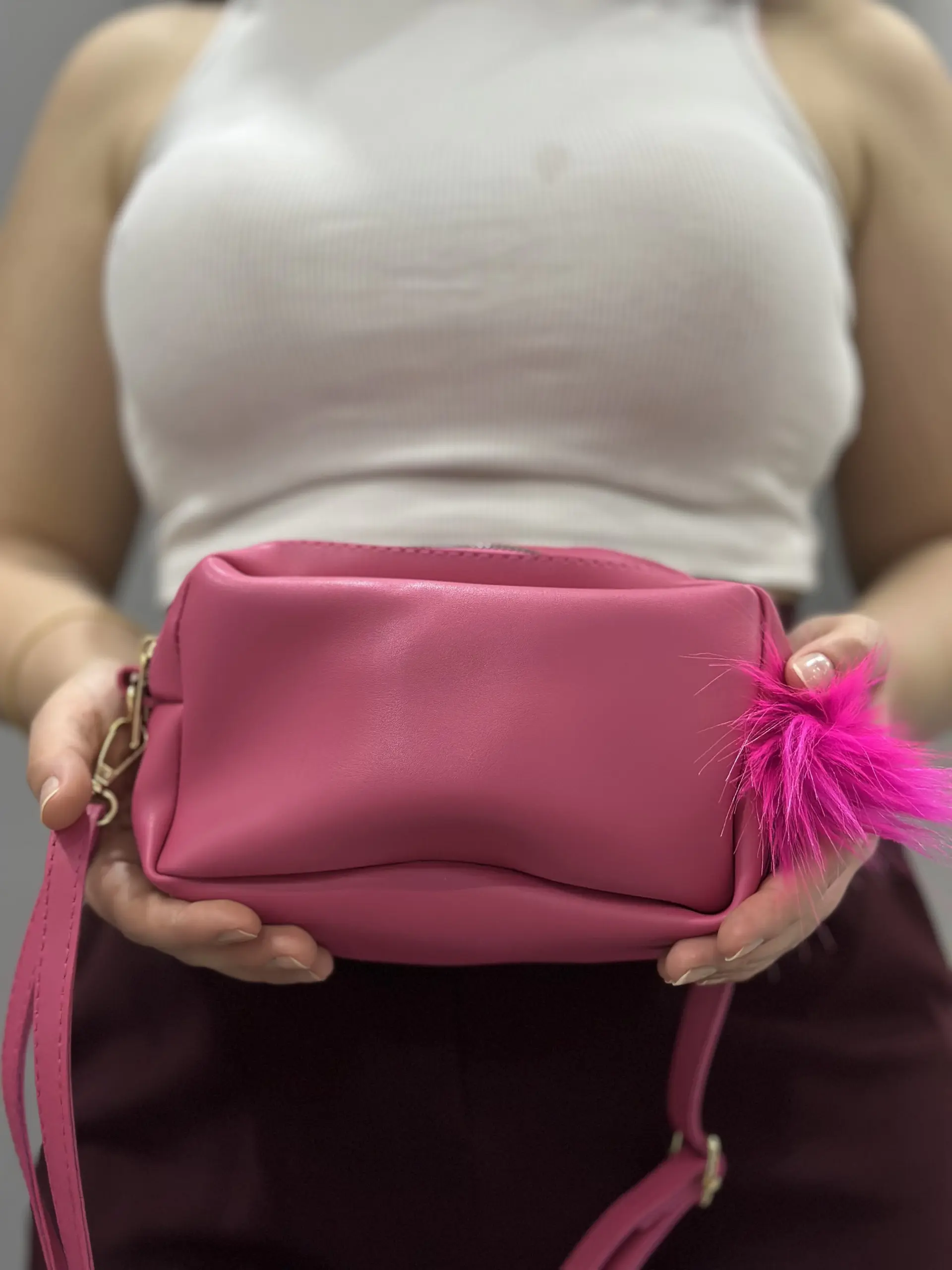Ponpon fuşya cilt çanta